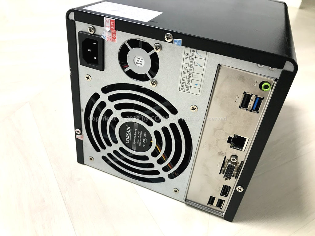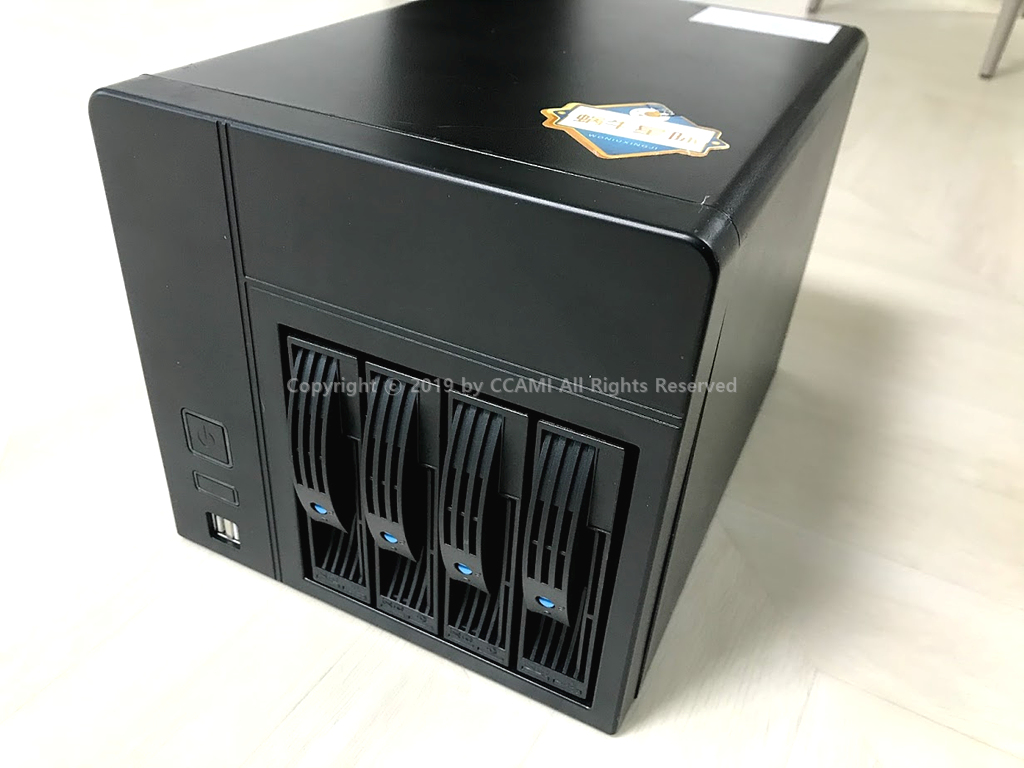 케이스이다. 일반적으로 우리가 생각하는 PC의 케이스랑은 많이 다른 형태이다. 앞에 보면 하드베이 4개가 있다. 이 하드베이 덕분에 이 깡통 PC는 최고의 NAS로 사용될 수 있는 것이다. 무려 4개의 하드베이라니. 이 때문에 비교대상이 되는 제품군이 시놀로지의 DS918+ 모델이다.