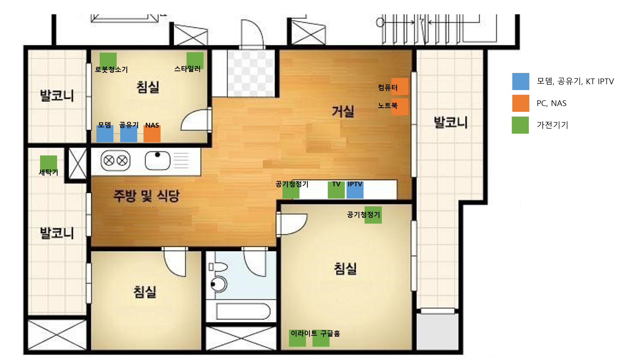 다행히도, 공유기 성능이 충분하여 부엌 발코니에 있는 세탁기도 문제 없이 무선으로 연결이 됩니다. 또한, 침실에 있는 이라이트나 구글홈도 끊김 없이 무선으로 잘 연결됩니다. 물론 스마트폰으로도 어디를 가던 와이파이의 끊김은 없고 속도도 잘 나옵니다. (그래봤자 집 인터넷 100M짜리...)