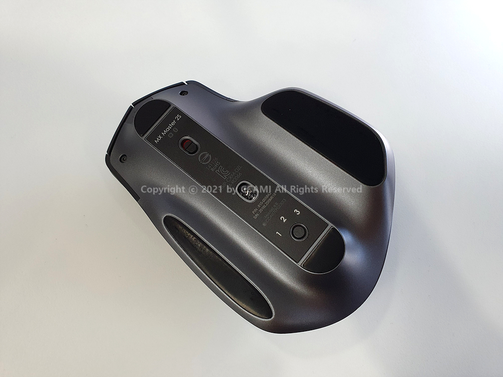 아래는 전원버튼과 스위칭을 할 수 있는 버튼이 있습니다. MX MASTER 2S 역시 3개의 기기까지 등록해서 사용할 수 있고 유니파잉 연결과 블루투스를 지원합니다. 여러개의 기기를 등록하여 FLOW라는 기능을 사용하여 뭐 기기간의 전송을 할 수 있다고 하는데 거기까진...