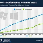윈도우8, 윈도우 8.1이 망했다는 말들이 많다. http://www.itworld.co.kr/news/85153 윈도우 98부터 윈도우 8.1까지 다 써봤지만, 윈도우 XP, 7이 확실히 뭔가 잘 만들어 지긴 한거 같다. 윈도우 XP 전에는 윈도우 ME, 윈도우 7 전에는 윈도우 Vista라는 아픈 과거가 있었지만... 그래프가 보여주는 것 처럼 확실히 윈도우 8이 윈도우 7 보다 점유율이 낮다. 윈도우 7을 사용하는 사람이 8로 안넘어 가는 것도 많고 아직 7을 더 많이 쓰는것도 맞다. 막 사람들이 8 안좋다고.. 시작버튼 없다고.. 익숙하지 않다고.. 그런거 때문인거 같다. 근데 당연한거 아닌가. 출시된지 4년이 된 OS랑 출시된지 이제 1년된 OS랑 점유율 비교하는 것 자체가...3년전 윈도우7의..